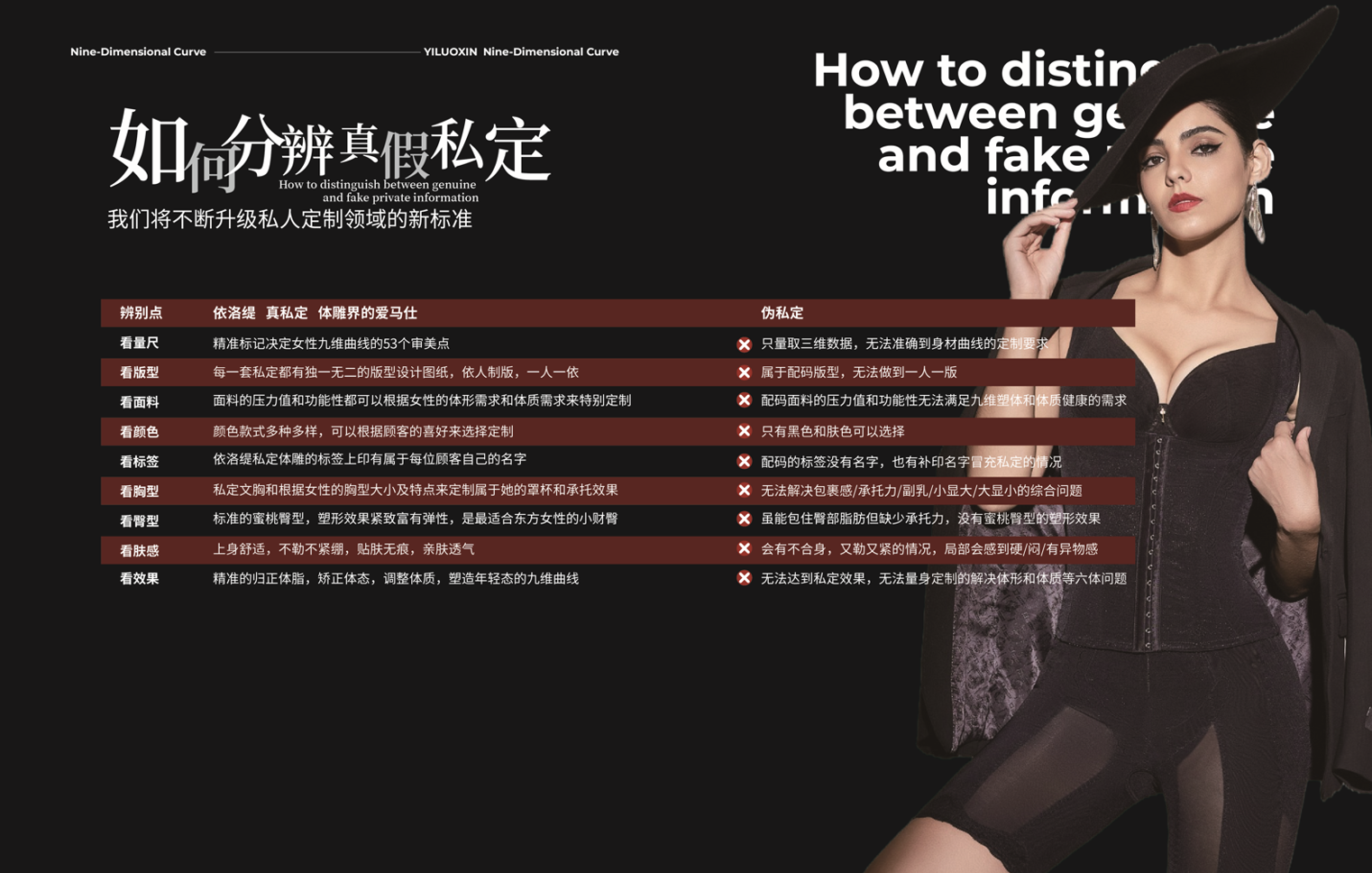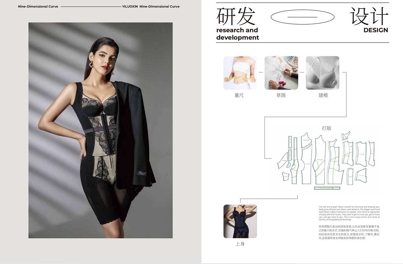 我们始终坚守对产品材料和精湛工艺的苛刻要求。每一块面料都经过严格筛选,每一道工序都经过精细把控,从纤维的柔软度到裁剪的精准度,无不彰显出对细节的极致追求,从量尺设计的方式就颠覆了传统配码模式,通过53个审美点,精准的描绘出每位女性独一无二的身材现状,再通过香港理工大学的物理压力值测试,为每一寸肌肤匹配不同压力值的面料,为身体的每一处需要,匹配各种功能性面料,从体格、体形、体质、体脂、体态、体龄六方面,为女性量身定制属于她的贴身伴侣,柔软锁脂,弹性亲肤,贴合塑身,让每位女性终于能体验到拥有九尾曲线的极致感觉。
